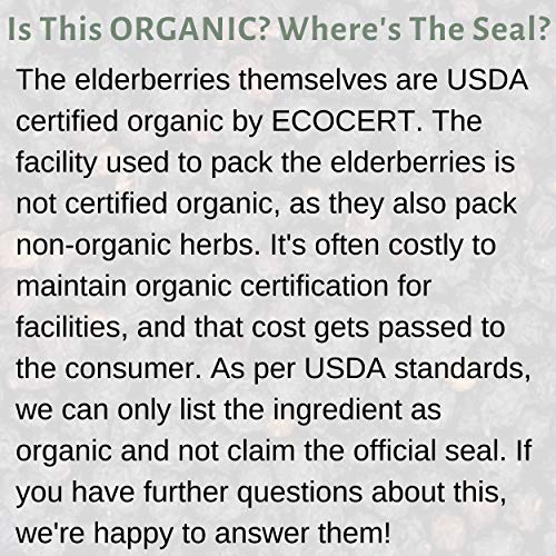 ✔ ORGANIC SOURCED, NON-GMO, BPA-FREE: Our non-irradiated whole elderberries dried are non-GMO and organic sourced from organically certified growers, and our resealable packaging is always BPA-free.