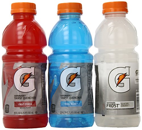 Rehydrate, replenish and refuel with Gatorade. When you sweat, you lose more than water. Gatorade Thirst Quencher contains critical electrolytes to help replace what’s lost in sweat. Gatorade Thirst Quencher hydrates better than water, which is why it’s trusted by some of the world’s best athletes. This sports drink variety pack includes 8 Glacier Cherry 20 oz. bottles, 8 Fruit Punch 20 oz. bottles, and 8 Cool Blue 20 oz. bottles.