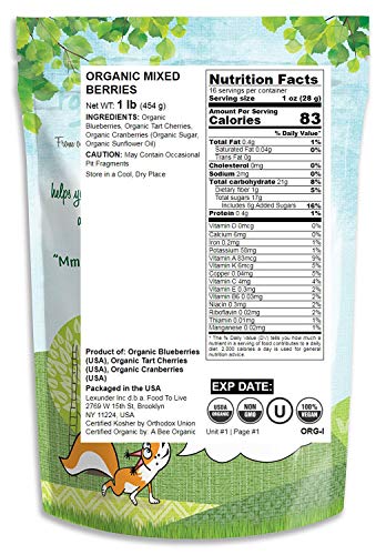 Organic Mixed Berries consists of three types of organic berries: Organic Blueberries, Organic Tart Cherries, Organic Cranberries and Organic Sugar, Organic Sunflower Oil.