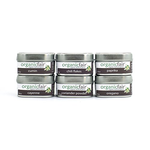 Experience the vibrancy of Mexico when you cook with these organic spices inspired by Mexican cuisine. This set contains 6 4oz tins of certified organic cayenne powder, chili flakes, oregano leaves, coriander powder, cumin powder, and paprika powder.