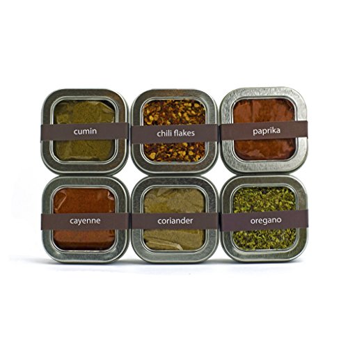 This set contains: cayenne, chili flakes, oregano, coriander, cumin, and paprika