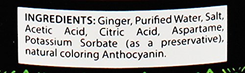Ingredients: Ginger, Purified Water, Salt, Acetic Acid, Citric Acid, Aspartame, Potassium Sorbate (as a preservative), Allure Red.