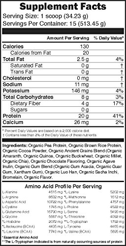 Contains: Organic Pea Protein, Organic Brown Rice Protein, Organic Cocoa Powder, Organic Ancient Grains Blend (Organic Amaranth, Organic Quinoa, Organic Buckwheat, Organic Millet, Organic Chia), Organic Chocolate Flavoring, Organic Agave Inulin, Organic Gum Blend (Organic Gum Acacia, Organic Guar Gum, Xantham Gum), Organic Luo Han, Organic Sacha Inchi, Bromelain, Organic Flavor.